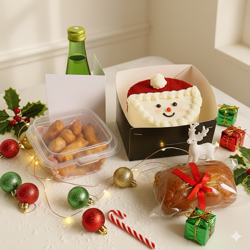 -mini 4″ Santa Christmas cake, midi banana bread loaf, single serving chops pack, small fruit wine, greeting card